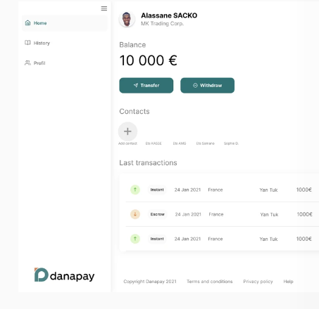 - Danapay is secure payment solutions developed using advanced blockchain technology between Africa and Europe countries. I developed complex frontend interfaces in both admin and customer side using React.js, Redux, MUI, and focused on improving performance side.